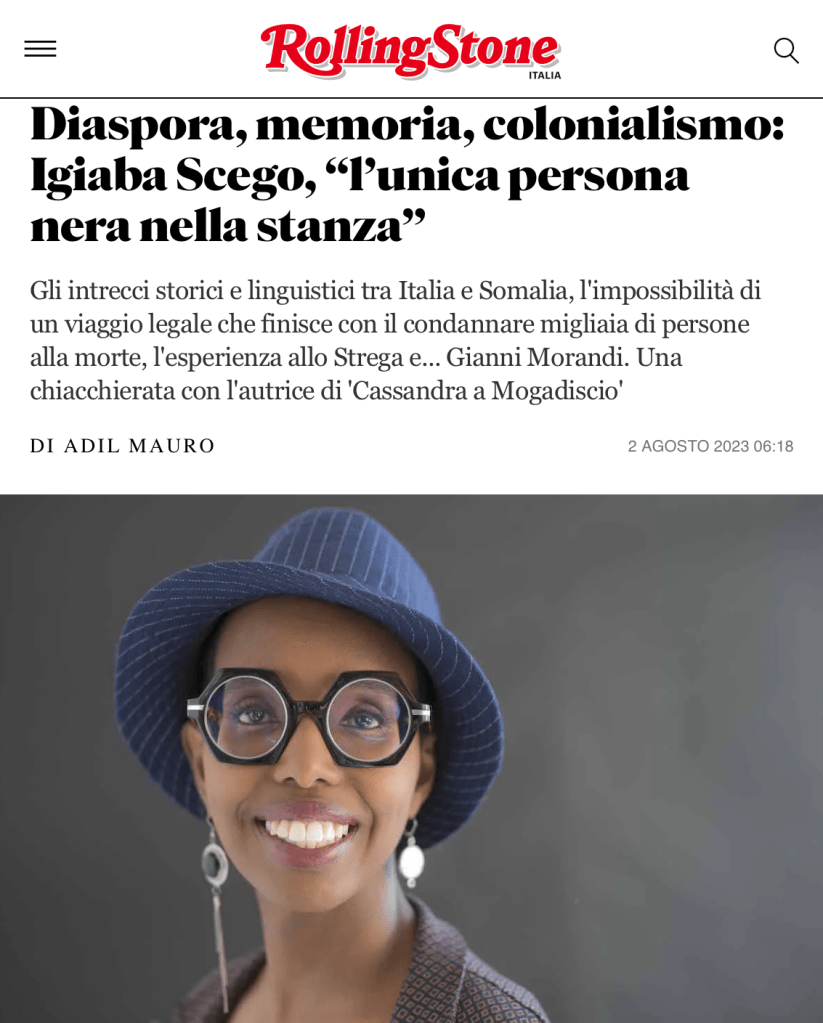 “Cassandra a Mogadiscio” (Bompiani) è l’ultimo libro della scrittrice italiana di origine somala Igiaba Scego.